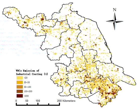 Emissions from industrial coating sources were allocated based on their geographical coordinates (Figure 3). From the perspective of regional distribution, VOCs emissions from the industrial coating industry were concentrated in five cities in southern Jiangsu (Nanjing, Suzhou, Zhenjiang, Changzhou, and Wuxi) and Xuzhou, accounting for 77% of the province’s emissions. Suzhou has the highest VOCs emissions, accounting for 35% of the total emissions.