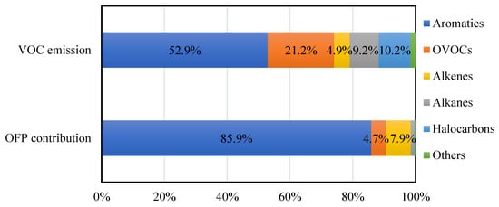 where OFPi is the ozone formation potential, referring to the O3 quality generated by the emission of ith VOCs species, and mi is the emission amount of the ith VOCs species. MIRi is the maximum incremental reactivity, referring to the maximum incremental reactivity (MIR) of the ith VOCs species, which were obtained from previous studies [15,21].