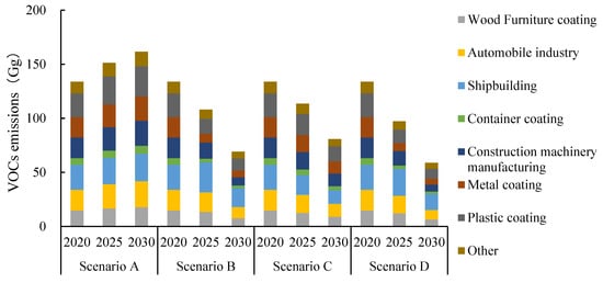 Combined with future economic development, as well as the implementation of policies and upgrade of control technologies, four scenarios (scenarios A, B, C, and D) were set up to predict VOCs emissions of the surface-coating industry for the years 2025 and 2030, respectively. Scenario A was a benchmark scenario considering the development of socio-economic and pollution control policies being maintained at the current level. Scenario B was a coating substitution scenario, where the substitution of low-VOCs content coatings (such as water-based coatings and solvent-free coatings) increased dramatically, while the development of end-of-pipe treatment technologies was constant. Scenario C was an end-of-pipe treatment scenario, where the best available control technologies were assumed to be implemented, while the substitution of low-VOCs content coatings was constant. Scenario D was a scenario considering maximum emission reduction potential, where every source made great efforts to control VOCs emissions, including coating substitution combined with end-of-pipe treatment measures. These four scenarios are described in detail in Table 6. The numbers for 2025 were set by the historical statistical data and the Pollution Control Plan [26] published in Jiangsu province, and the numbers for 2030 were set by the linear extrapolation of 2020 and 2025. All the parameter values were set based on the control technology economic and technical feasibility analysis results.