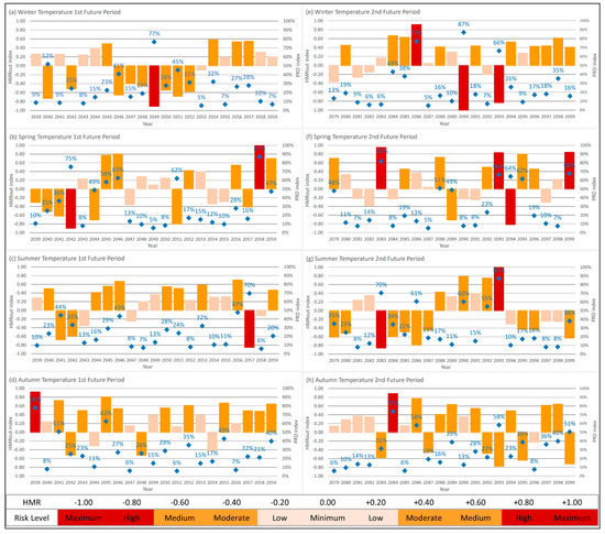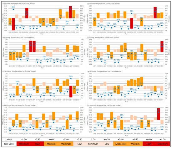 From the aforementioned findings, it was evident that the future ideal temperature conditions will increase, posing new adaptation challenges to the structural monuments under a much warmer climate. In this section, the future risk of the microclimate (HMRout) index and the Predicted Risk of Damage (PRD) index to heritage were computed and analyzed on a seasonal scale. Figure 4 and Figure 5 depict the seasonal analysis of the HMRout index and PRD index for temperature for both future periods and case studies. The classification of the HMRout index regarding the risk level was primarily introduced by Fabbri and Bonora [42] and considers not only extreme risk conditions (minimum and maximum) but also intermediate risk conditions (low, moderate, medium, and high). The PRD index was applied to inorganic materials in the present study because of the fact that most of the monuments in the Greek area are made of stone (usually limestone) and marble [57,58]. The results showed that the Predicted Risk of Damage (PRD) for inorganic materials was directly dependent on the HMRout index, meaning that when the HMRout index reaches its maximum value, the risk of damage reaches 100%. The number of years (in %) where the HMRout index took a value >0.4 or >−0.4 were also estimated by calculating the difference as (Reference period—1st future period (2nd future period)) (not shown).