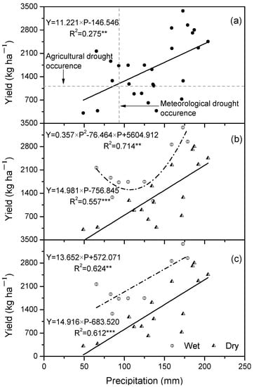 The relationship between spring wheat yield and precipitation during spring wheat growing season. (a) The relationship between yield and precipitation without taken soil conditions into consideration, (b) The different relationships between yield and precipitation with taken soil conditions into consideration, (c) The different liner relationships between yield and precipitation with taken soil conditions into consideration. Soil conditions was classified into two groups by the amount of soil water content at planting of greater or less than 100 mm. *** and ** indicate significance levels of 0.001 and 0.01. The ANOVA analysis of the regression equations under different soil conditions are shown in Table S1.