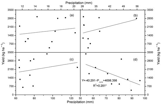 Responses of spring wheat yield to the ten greatest records of precipitation from March to June. (a) March, (b) April, (c) May, (d) June. * indicates significant level at 0.05.