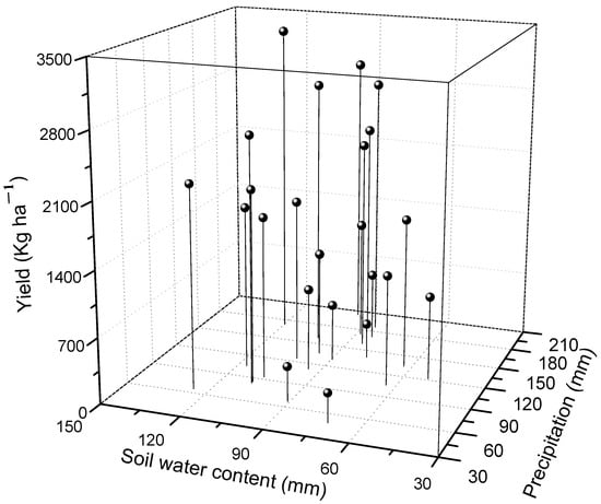 For rainfed farming systems, soil water content and precipitation are the two main water resources for spring wheat development and growth. We plotted precipitation, soil water content, and yield in one figure (Figure 3). Soil water content at planting varied from 51.2 to 235.0 mm in the 50 cm soil profile, as influenced by precipitation during several months before planting. With the change in soil water content and precipitation, the spring wheat yield ranged widely from 310 to 3373.7 kg ha−1. From the data presented in Figure 3, we found that high precipitation and high soil water content at planting resulted in high spring wheat yields, and low precipitation and low soil water content at planting obtained low spring wheat yields; however, for other combinations of water content and precipitation there appeared to be no obvious relationship between soil water content, precipitation, and spring wheat yield.