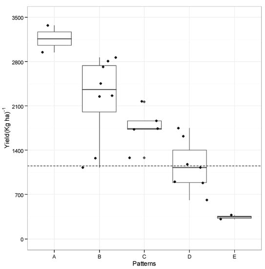 Cluster analysis was applied to spring wheat yield, soil water content, and precipitation. Five different patterns for spring wheat yield were identified (Figure 4). The average yield of each pattern was 3161.4, 2169.1, 1756.8, 1152.8, and 342.5 kg ha−1, respectively (Figure 4 and Table 4 and Table S1). As shown in Table 4, spring wheat yield decreased when precipitation decreased, except in pattern D. In the 1st quartile, 3rd quartile, and median (Table 4), pattern D was characterized by low soil water content at planting and medium precipitation during the spring wheat growing season, which resulted in a medium-low spring wheat yield. This pattern was called ‘the low soil water content at planting–medium precipitation during spring wheat growing season–medium low spring wheat yield (LM-ML)’. In contrast, pattern C had a high soil water content at planting and low precipitation during spring wheat growing season, which led to a medium spring wheat yield. The pattern was labeled as ‘high soil water content at planting–medium precipitation during spring wheat growing season–medium spring wheat yield (HLM)’. Pattern B had medium soil water content at planting and high precipitation during the spring wheat growing season, which contributed to a medium-high spring wheat yield, the medium soil water content at planting, high precipitation during spring wheat growing season, and medium high spring wheat yield (MH-MH). The highest spring wheat yield level was associated with the highest soil water content at planting and higher precipitation during spring wheat growing season, known as HHH. For the lowest yield level, the water conditions were characterized by the lowest soil water content at planting and the lowest precipitation levels during the spring wheat growing season, defined as the LLL pattern.