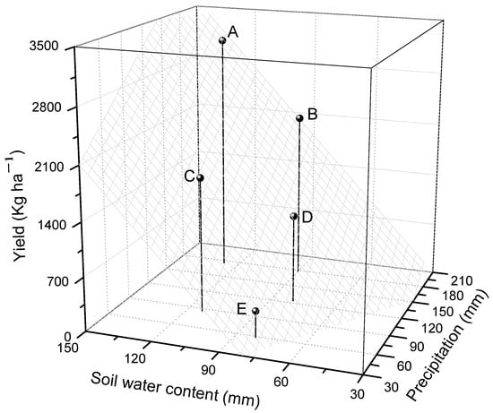 In Equation (1), we found that the levels of soil water content and precipitation were different from each other. The level of soil water content was 29.9 kg ha−1 per mm, which was 2.86 times higher than precipitation at 12.2 kg ha−1 per mm. The levels of the two water supply factors indicated water use efficiency for soil water content and precipitation, respectively. Obviously, higher soil water storage at spring wheat planting resulted in higher yields than precipitation did. Moreover, examining the data from 1987 to 2011, the result was same (Equation (2)).