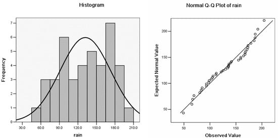 The relationships between precipitation during the main growing season and spring wheat yield were described by linear regression analyses through SPSS 20.0. For the combination of spring wheat yield and soil water content at planting and precipitation, a stepwise method of linear regression was adopted with a significance level at 0.05 in SPSS. The statistical characteristics of precipitation during spring wheat growing season from 1971–2011 were analyzed by using SPSS software. Normal distribution tests applying the Kolmogorov–Smirnov (K-S) method were analyzed using Orgin 9.0 software.