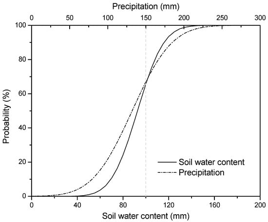 The objective of agriculture production is to obtain a final crop yield that is as high as possible. Therefore, one of the common ways of determining agricultural drought is based on the deviation of a major crop yield in a specific region from its long-term mean []. In that case, we could conclude whether agricultural drought occurred or not through the final level of a specific crop yield in a research area. However, in many cases, drought indices based on precipitation or other climatic parameters during growing season predict final crop yield poorly []. Since the main basis for the identification of agricultural drought is crop yield, water budgets for crops and, thus, soil–plant units are at the heart of agricultural drought research []. However, weather conditions during crop growing season are not the only factors determining the water budget for crops. Soil water content plays a central role in the control of the terrestrial water cycle [], and rates of transpiration, carbon assimilation, and biomass production are often limited by it during the crop-growing season []. However, the soil water during crop-growing season not only stems from precipitation during crop growing season but also from the precipitation before crop planting. Therefore, the soil water content at planting is one of the most important water supply resources for crop growth and development [,], and it could have great influence on crop final yield, especially for crops with a short growing season [,]. Therefore, soil water content at planting has a great influence on determining agricultural drought occurrence in certain specific areas.