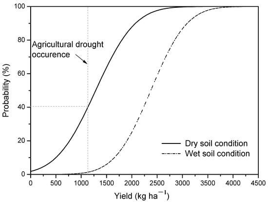 Spring wheat is one of the most important crops grown in the semi-arid areas in the northwest of China, where crops are mainly rainfed, even though the amount of rainfall is limited and erratic. In this area, the growth, development, and final yield of spring wheat is greatly influenced by water supply and water is the main limiting factor for spring wheat growth and yield. Consequently, understanding the relationship between water and the final yield spring wheat is essential to determine agricultural drought occurrence, improve agriculture management techniques, and adopt feasible strategies to deal with drought in this area. Therefore, the objectives of this study were to: (1) quantify the influence of soil water content at planting on determining agricultural drought for spring wheat and (2) determine the probability of agricultural drought occurrence during spring wheat growing season in this area.