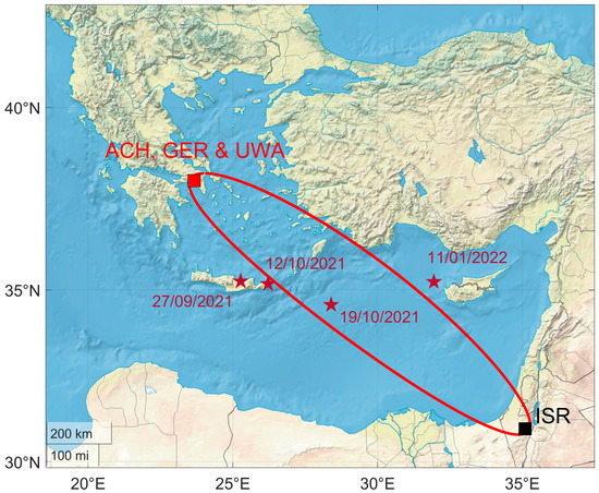 In Table 1, we give information about the EQs under study, taken from the seismic catalog of the National Observatory of Athens (NOA) (https://bbnet.gein.noa.gr/HL/databases/database) (accessed on 29 November 2022). All four of them took place in the southeastern Mediterranean from September to October 2021 and January 2022. Specifically, the EQs mentioned above are the 2021 Crete EQs and 2022 Cyprus EQ, which are indicated in this table in the column “EQ group”. Table 1 includes the EQ’s occurrence time, magnitude, depth, and coordinates of each epicenter. We should also mention that these EQs have a magnitude of 5.5 above, so they are expected to significantly perturb the lower ionosphere [1]. Moreover, we note that for this study, we search for EQ-related signatures within 15 days before each target EQ. In Figure 2, we show the map of the eastern Mediterranean where a representative fifth Fresnel zone of the sub-ionospheric propagation path is shown between each receiver and the transmitter ISR. The EQs chosen for this study are relatively close or within the fifth Fresnel zone of each monitored propagation path between the transmitter ISR and each receiver (UWA, ACH, and GER).