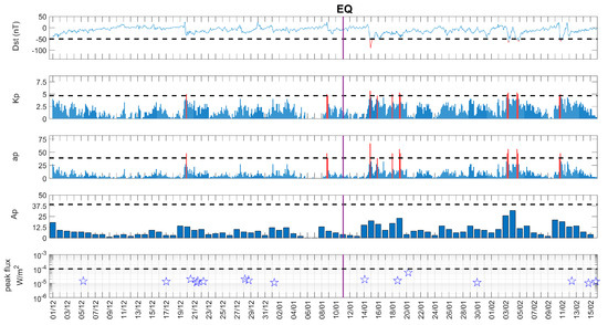 Additionally, for the 2022 Cyprus EQ, the variation of geomagnetic indices (Dst, Kp, ap, Ap), as well as the peak flux () of solar flares, are all shown in five panels for the period from 1 December 2021 until 15 February 2022. We have retrieved the data of Dst, Kp, ap, and Ap from the World Data Center for Geomagnetism of Kyoto (https://wdc.kugi.kyoto-u.ac.jp/wdc/Sec3.html (accessed on 29 November 2022)), while for solar flares we checked the data on solar X-ray flux from the National Oceanic and Atmospheric Administration (https://www.swpc.noaa.gov/products/goes-x-ray-flux (accessed on 29 November 2022)). As is evident from Figure 3, one moderate geomagnetic storm of −91 nT (min Dst) occurred on 14 January 2022, while a simultaneous enhancement (shown with red color) in the two geomagnetic indices (Kp, ap) appears for a very short time (one bin) period. Finally, in the bottom panel, we present all solar flares of the M and X classes that occurred in the abovementioned period. It can be observed that there were several solar flares of the M class in the entire period, but no X class solar flare.