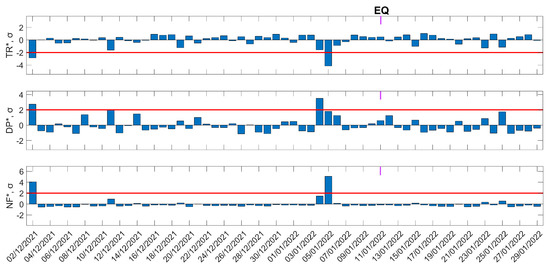 Time evolution of three statistical quantities, , of the NFM analysis method for the sub−ionospheric path GER−ISR is shown in the top, middle, and bottom panels, respectively. The time period represented in the figure is from 2 December 2021 to 29 January 2022. Red solid horizontal lines indicate the corresponding +2 /−2 limits; is calculated for the whole studied period of each panel. The date of EQ is shown on top of each panel by the purple vertical line segment, marked on the top of each panel.