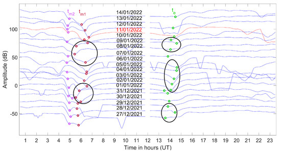 In Figure 5, we give an example of the diurnal variation in sequential plots for the 2022 Cyprus EQ. In this figure, the diurnal variation of the amplitude is presented in the form of stacked 24 h signals, shifted by 10 dB. The date corresponding to each stacked signal appears in the middle (above the signal), while the selected period of this figure is from 27 December 2021 to 14 January 2022, including 15 days before the 2022 Cyprus EQ. Moreover, in Figure 5, it can be observed that two sets of TTs appear on the morning side (purple and brown circles), while on the evening side (green circles), there is only one set of TTs. In this study, we show TTs shifted towards night (see Section 2). Specifically, in the morning TTs, the brown minima appeared largely shifted (see black ellipses) towards the night on 1, 2, 8 and 9 January 2022, preceding the date of the EQ (red color). On the other hand, pre-seismic shifts are also indicated in the evening TT, which are marked as black ellipses. More specifically, significant shifts in the evening TT minima have been observed on 28 December 2021 and 9 January 2022, while a gradual shift of TTs appeared to have existed from 2 January 2022 to 6 January 2022.