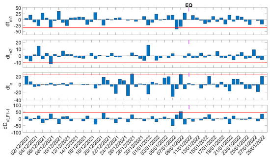 In this work, we have also applied the TTM analysis to show which pre-seismic anomalies have adequately been shifted (morning or evening TT) for each day by exceeding the threshold of . More specifically, we have found the shifted TTs towards nighttime by finding the amount of shift. The procedure that has been followed is described in Section 3.2. In Figure 6, we give an example of TTM analysis for the 2022 Cyprus EQ. We have found significant shifts of TTs, which exceed the 2 criterion, searching for anomalies in the same studied period (2 December 2021–29 January 2022), as in the case of the NFM analysis. For the first set of TTs on the morning side towards the day, we calculated the difference of the set of TTs from the running mean window by constructing the time series (see Section 3.2). The same procedure (see Section 3.2) was applied for the other TT sets by calculating and , as well as the time series (shift of “VLF daylength”). We note that the symbolization of (the same holds for each kind of shifted “VLF daylength”, e.g., ) shows first (reading towards right) the number of sets of TTs that are on the evening side, while the second number indicates the set of TTs that are on the morning side. As we can see, one decrement on 8 January 2022 is observed in the first panel of Figure 6, which is symbolized as by exceeding (shifted by −40.6 min) the threshold of 2 of the whole studied period (2 December 2021–29 January 2021). In the second panel for a shift not related to the EQ anomaly (shifted by −12.2 min) appeared on 8 December 2021. Moreover, in the third panel for , only one anomalous (shifted by 26.9 min) day on 28 December 2021 existed, while in the fourth panel, presenting , one increment (shifted by 53.9 min) on 9 January 2022 has been observed.
