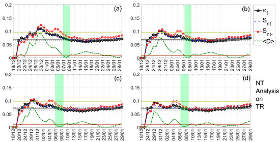 NT analysis of the VLF propagation quantity time series of the propagation path ISR–ACH for the examined period (18 December 2021–29 January 2022). The presented temporal variations of the NT parameters correspond to the different thresholds of : (a) 2, (b) 2.5, (c) 3, (d) 3.5, respectively. The limit value of the entropy appears as a horizontal solid light green line, while the value 0.07, along with the region around it, are denoted by a horizontal solid grey and two horizontal dashed grey lines, respectively. The limit is shown as a horizontal brown line. The light green patch in each panel indicates the presence of criticality according to the conditions set by NT analysis. The events in each panel depend on the corresponding threshold. Moreover, although the conventional time (date) of occurrence of each corresponding event is noted in the x-axis tick values, the x-axis scale actually follows the NT representation; for this reason, the x-axis is not linear in conventional time. Date format is day/month (for dates that belong to December the year is 2021, while for January the year is 2022).
