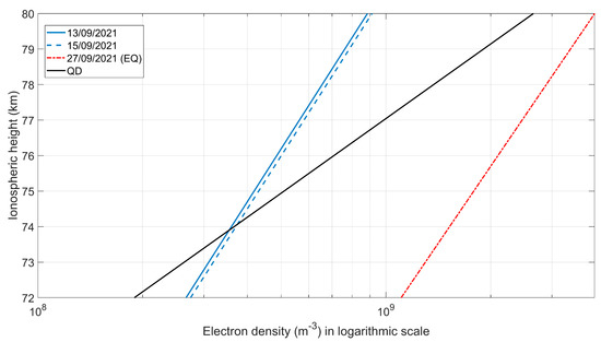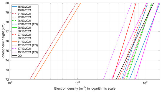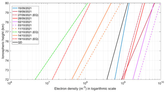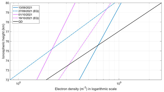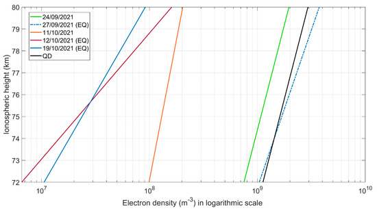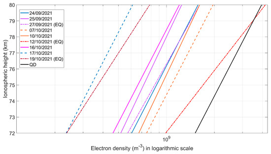 Altitude profile of ionospheric ED around the time of SRT1 obtained from ISR–GER path with respect to the 2021 Crete EQs. The y-axis and x-axis denote the ionospheric height in km and the ED in logarithmic scale, respectively. “QD” and “EQ” lines represent the variation of normal days and the EQ day, respectively.