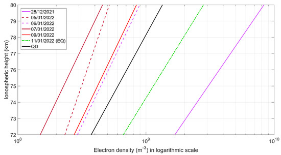 The similar variation of the altitude profiles of ED at SRT and SST for the ISR–UWA path during the 2022 Cyprus EQ on 11 January 2022 is shown in Figure 15 and Figure 16, respectively. It is evident from Figure 15 that a considerable amount of decrement of ED is observed on the day of the EQ (11 January 2022), and intermediate decrease in EDs from the quiet day ED profiles (QD) are observed on 1, 8 and 9 January 2022. For the SST, a similar decrement in the ED profiles has been observed before the EQ day (on 5, 6, 7 and 9 January 2022), while for the day of the EQ, the ED profiles slightly increased. This is quite an exciting result where the co-seismic effect is somewhat opposite to the pre-seismic variation.
