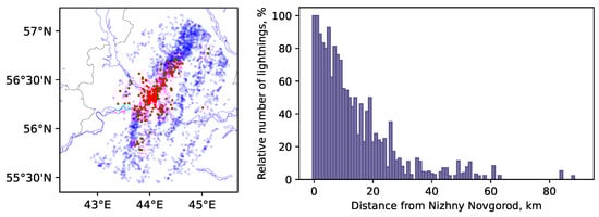 The efficiency of the tool is illustrated in Figure 2 using the lightning activity in the Nizhny Novgorod region on 13–14 July 2020 as an example. All lightning events detected by the WWLLN within a radius of 100 km from the observation point are shown in the left panel by the blue color. The discharges that coincided in time with the discharges determined according to the EFM measurements are marked by the red color. The ratio of the number of lightning events registered by both the EFM and WWLLN to the number of all lightning events detected by the WWLLN is demonstrated in the right panel. Figure 2 confirms the EFM documentation [34], which states that the maximum radius for detecting lightning is 38 km.