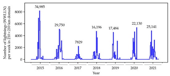 The previous studies revealed that about 34 convective events (including several severe thunderstorms) in Nizhny Novgorod occur annually [45]. The most powerful and prolonged thunderstorms are usually intra-mass ones and come from the southern direction. Such thunderstorms are characterized by a long duration (sometimes more than 6 h) and continuous lightning activity, while the number of lightning discharges can reach 1500. The year-by-year trend of lightning activity in the investigated domain is shown in Figure 3. The total number of detected lightning events for each year is labeled on the chart. The relatively low thunderstorm activity of 2016 is explained by the cold summer (the average air temperature did not exceed 13.7 C [32]). It can be seen that since 2016 the annual number of lightning events has been monotonically increasing.