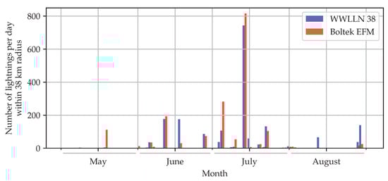 Figure 4 shows the number of lightning discharges in the convective season of 2020, registered using the WWLLN and EFM. The presented WWLLN data have been selected for an area with a radius of 38 km around the observation point (the radius was chosen according to the Boltek EFM Operators Guide [34]).