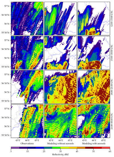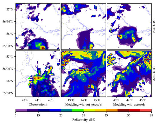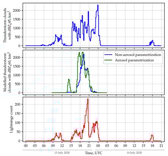 When comparing the radar reflectivity obtained from observations and simulations, we found that the model overestimates the reflectivity values. The threshold value was selected according to the maximum volume of thunderstorm cells. The volume of simulated thunderclouds with a radar reflectivity of more than 60 dBZ is shown in Figure 11 (central panel). The blue curve is used for the non-aerosol simulation, and the green curve is used for the aerosol one. When counting cell volume with a reflectivity above 45 dBZ (as for the radar data), we obtained values that are an order of magnitude larger than for radar observations. To obtain comparable maximum values, we had to raise the reflectivity threshold to 60 dBZ (see the central panel of Figure 11). Previously, the results of radar reflectivity simulations using the WRF model and the WWLLN data for several convective seasons in the Nizhny Novgorod region were compared in [15]. It was shown that, for the area under consideration, the best correlation was observed at a threshold value of 55 dBZ. Thus, some differences in the maximum values of the radar reflectivity obtained in the simulations and according to the observational data (see Figure 6) can be associated with a systematic overestimation of this parameter in the simulation of convective events in this area.