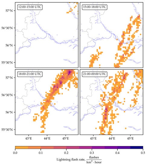 Sun et al. [30] noted a need to carry out numerical experiments aimed at studying the effect of aerosols acting as ice nuclei on lightning activity. Zheng et al. [31] pointed out that the characteristics of lightning activity in severe thunderstorms are different from those in regular thunderstorms. For this reason, a detailed study of the characteristics of individual powerful thunderstorm events is of great interest.