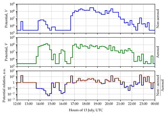 Electric parameters. To study the electric characteristics of the thunderstorm in the Nizhny Novgorod region on 13–14 July, the electric potential and the intracloud electric field were calculated. According to the simulation data, high values of the electric potential were observed from 14:20 to 00:00 (+1) UTC, preceded by a single cell from 12:40 to 13:00 for the non-aerosol modeling and from 14:00 to 00:20 (+1) UTC for the aerosol modeling. Figure 8 shows the time dependences of the maximum values of electric potential for the non-aerosol and aerosol parametrizations of the microphysics, as well as the time dependence of their ratio. The vertical axis is on a logarithmic scale. When the ratio of the potentials takes on a value less than one, this means that, for a given time interval, the electric processes in the aerosol simulation are more intense, and, conversely, for values greater than one, the electric processes simulated without aerosols are more intense. The thunderstorm began to develop more rapidly in the aerosol simulation, and the thunderstorm duration was longer. The maximum simulated electric potential was 328 MV without aerosols and 144 MV with aerosols. The maximum values of the electric potential obtained in the experiments vary from 0.4 MV to 1300 MV (see, for example, [48,49,50,51]); that is, the values obtained in this work fall within the range of observed values.