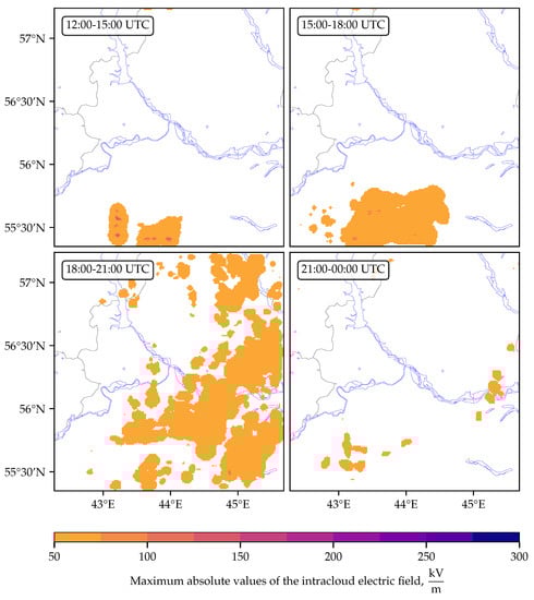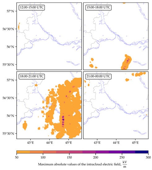 Figure 9 and Figure 10 show the maximum absolute values of the intracloud electric field every 3 h from 12:00 13 July 2020 to 03:00 14 July 2020, obtained by the modeling with non-aerosol and aerosol parametrizations of the microphysics, respectively. In these figures, one can also see an earlier onset and a longer duration of the thunderstorm in the aerosol simulations. At the same time, the maximum value of the intracloud electric field strength obtained in simulations with the non-aerosol microphysical parametrization exceeds the same value obtained in the modeling with aerosols.