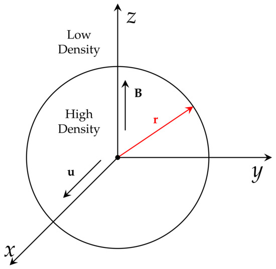 For Equation (3), we can rewrite , where represents the direction perpendicular to the magnetic field (i.e., and ), while represents the direction parallel to to the magnetic field (i.e., ). The geometry for this numerical model is the following: is north, is east, and is down or vertical, as shown in Figure 1. Additionally, it is beneficial to set to be along the direction of neutral wind, since it is the direction of motion of the plasma cloud, thus determining which interface will be unstable to the GDI (the interface at which the GDI will grow).
