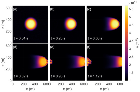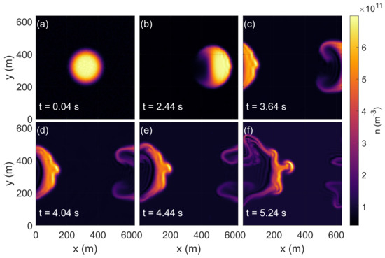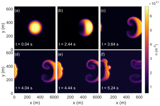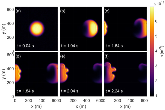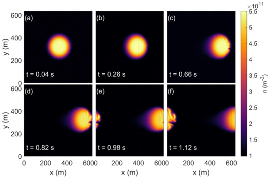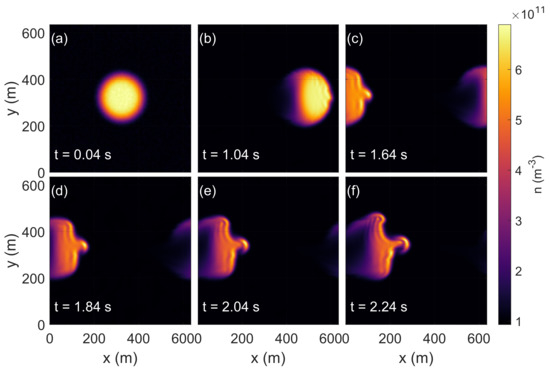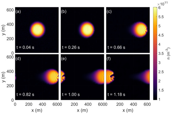 In this section, we investigate the results of the gradient drift instability (GDI) in a plasma cloud using our previously developed two-dimensional fluid numerical model [8,13]. We consider three regimes: highly collisional, collisional, and inertial. Figure 2 shows a 2D simulation of a plasma enhancement cloud for a highly collisional regime with an ion-neutral collision frequency of , which corresponds to an altitude of approximately 200 . Due to the direction of the density gradient and its interaction with the neutral wind in the direction, the plasma cloud drifts to the right, as shown in Figure 2b. There are no signs of the trailing edge rolling up into themselves. Instead, a smooth tail extends out because of the high collisionality. In Figure 2c, the leading edge (i.e., right side) becomes unstable to the GDI and begins to bifurcate as a nested finger-like structure extends outwards. Figure 2d shows the continued growth and extension of the nested secondary finger-like structure. The leading edges begin to bifurcate further as a secondary GDI-induced bifurcation forms, as shown in Figure 2e,f. Due to the fast neutral wind, a tail is observed to grow over time. Therefore, it is clear that the GDI dominates the structuring of a plasma cloud in the highly collisional regime. Additionally, it is worth noting here that for these simulations, the boundary conditions are double periodic, since the cloud leaves the domain on the right side and will loop around to reappear on the left side.