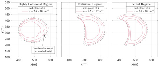 In Section 2, we present both nonlinear two-dimensional and three-dimensional simulations of the GDI and KHI, applicable to the plasma enhancement cloud. For the three-dimensional highly collisional simulation, at an early time in the evolution of the cloud, structures exhibit a “twist” as they develop, shown in Figure 5c. This is because of the ambipolar potential produced by the first term in Equation (3) (i.e., electron pressure terms parallel to in the potential equation) causing the cloud to rotate about its center field-aligned axis, which is aligned with the magnetic field in . The rotation rate varies with the position along the length of the cloud (along ), meaning the propagation rate is not uniform and it increases away from the mid-plane of ; therefore, this “shears” the cloud into a twist or “barber pole configuration” [6].