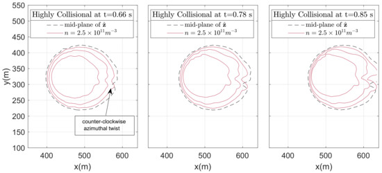 Figure 9 illustrates the azimuthal “twist” for the 3D simulations for each of the three regimes: highly collisional, collisional, and inertial. These plots demonstrate the evolution of the cloud particularly at early times, before any structuring dominates the cloud evolution. The density value is chosen close to the surface of the cloud, since the numerical simulations of Ref. [6] observe azimuthal flows in the vicinity of the cloud surface. In the highly collisional regime, we observe the azimuthal “twist”, and as we move further away from (above) the mid-plane of (black dashed line), the rotation becomes more prominent and it alters the flute-like character of the GDI, as evident by the narrow finger-like structures growing in the plane, indicating a finite in Figure 6. However, for the collisional and inertial simulations, there is little to no azimuthal rotation observed at the early times of the simulations. Instead, much later in time (not shown here), at the non-linear stage where the secondary KHI dominates the structuring, we observe some azimuthal “twisting” in that phase, particularly in the trailing edges. However, this azimuthal rotation is not significant enough to introduce a non-flute-like character in our structuring process (i.e., ). Similarly, for the collisional 3D simulations, the presence of ion inertia, even when not fully dominating the structuring process, still plays a role in the reduction in the azimuthal “shear” that we observe in the highly collisional case. Additionally, Figure 10 shows the counter-clockwise azimuthal twist for the highly collisional simulations at three different times, as we move away from the mid-plane of before any structuring dominates and the cloud bifurcates.
