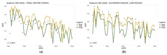 Modeled and observed budburst dates of two grapevine varieties: (a) Refošk–Teran variety at location Tomaj (sub-Mediterranean climate); and (b) Laški Rizling variety at location Slovenske Konjice (subcontinental climate). Yellow lines indicate results obtained with GDD, green lines indicate results obtained with BRIN, and black dots indicate the observed budburst date according to the Slovenian Environment Agency dataset. Added is the statistical significance (p) of the trend in observed budburst dates, calculated with the Mann–Kendall test, and day of year is denoted as DOY.