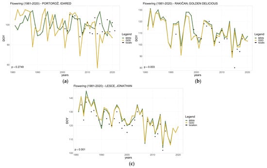 Modeled and observed budburst dates of three apple varieties: (a) Idared at location Portorož (sub-Mediterranean climate); (b) Golden Delicious variety at location Rakičan (subcontinental climate); and (c) Jonathan variety at location Lesce (moderate climate of the hilly region). Yellow lines indicate results obtained with GDD, green lines indicate results obtained with the model, and black dots indicate the observed budburst date according to the Slovenian Environment Agency dataset. Added is the statistical significance (p) of the trend in observed budburst dates, calculated with the Mann–Kendall test, and day of year is denoted as DOY.