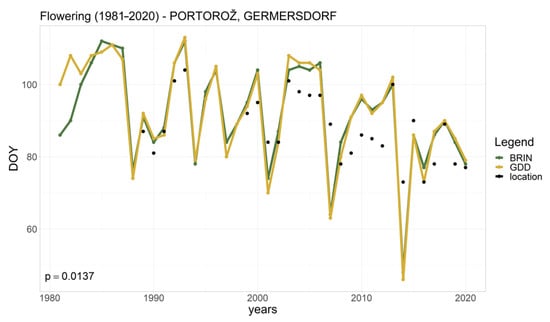 Modeled and observed budburst dates of the Germersdorf sweet cherry variety in Portorož, with the sub-Mediterranean climate type. Yellow lines indicate results obtained with GDD, green lines indicate results obtained with BRIN, and black dots indicate the observed budburst date according to the Slovenian Environment Agency dataset. Added is the statistical significance (p) of the trend in observed budburst dates, calculated with the Mann–Kendall test, and day of year is denoted as DOY.