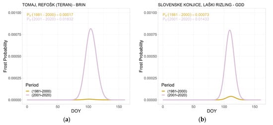 Two examples of modeled results of the probability of spring frost for the analyzed wine-making regions of Slovenia by their climate type: (a) sub-Mediterranean climate and the Refošk–Teran variety (Tomaj); and (b) subcontinental climate and the Laški Rizling variety (Slovenske Konjice). GDD5 model results are presented for both varieties.