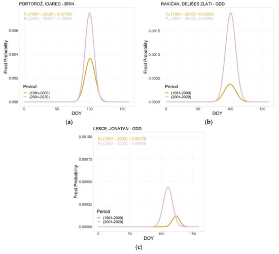 Three examples of modeled results of the probability of spring frost for the analyzed apple-growing regions of Slovenia by their climate type: (a) sub-Mediterranean climate and the Idared variety (Portorož); (b) subcontinental climate and the Golden Delicious variety (Rakičan); and (c) moderate climate of the hilly region and the Jonathan variety (Lesce).