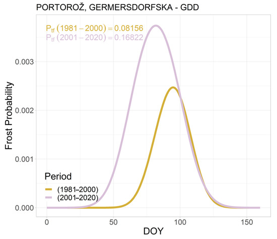 Similarly, as already illustrated for grapevine and apple, the calculated probability of spring frost in sweet cherry varieties is shown to be up to 180 times higher in 2001–2020 compared to the reference period 1981–2000, as shown in Figure 7 for the example of the Germersdorf variety at location Portorož. The Germersdorf variety is monitored at locations Bilje, Portorož, and Rižana. The chosen example represents the results of calculations based on the longest available sweet cherry variety dataset (Figure 7). In Portorož, frost risk appears to be approximately five times higher in the period 2001–2020 than in 1981–2000.