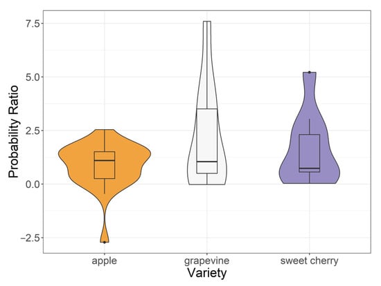 Violin plot of the modeled probability of spring frost ratio between Ptf(2001–2020) and Ptf(1981–2000) for the analyzed grapevine, apple, and sweet cherry varieties, in logarithmic scale. Additionally presented is the boxplot of the ratio values.