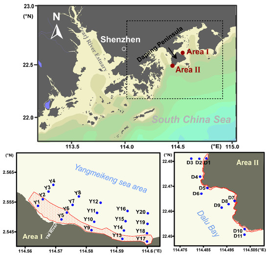 Sampling sites in the coastal waters near Dapeng Peninsula, South China Sea. Areas I and II are located in the Yangmeikeng sea area (Area I) and Dalu Bay (Area Ⅱ), respectively. YM River represents the Yangmei River. The red area in the figure indicates the coral reef area.