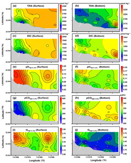 Distribution characteristics of TAlk (a,b), DIC (c,d), pHT@ in situ (e,f), pCO2@ in situ (g,h) and ΩA@ in situ (i,j) in the surface and bottom water of Dalu Bay (Area Ⅱ).