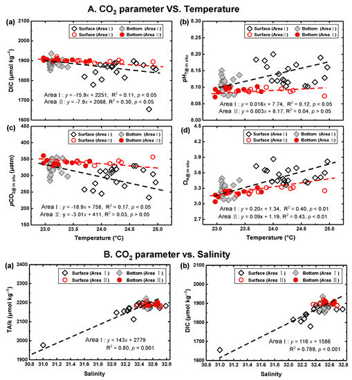 As shown in Figure 5, temperature was significantly negatively correlated with DIC (p < 0.05, n = 40) and pCO2 @ in situ (p < 0.05, n = 40), but positively correlated with pHT @ in situ (p < 0.05, n = 40) and ΩA @ in situ (p < 0.01, n = 40) in Area I. This indicated that temperature played an important role in the spatial variation of carbonate parameters [6], which explained 11–48% of their variability (Figure 5A). Similarly, temperature also showed a significant negative correlation with DIC (p < 0.05, n = 22), but a positive correlation with ΩA @ in situ (p < 0.01, n = 22) in Area Ⅱ, and their correlation was more significant than that in Area I (Figure 5A), which explained 48% and 60% of DIC and ΩA @ in situ variability. However, pHT @ in situ and pCO2 @ in situ were not significantly correlated with temperature, suggesting the influence of other processes [21,60,61].