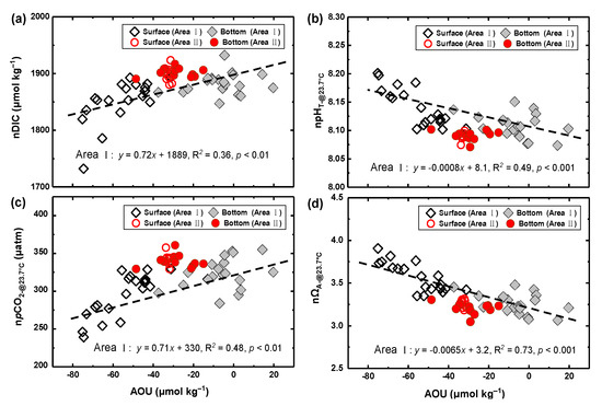 The correlation of inorganic carbon parameters with AOU (a–d) in the surface and bottom water of Yangmeikeng Sea Area (Area I) and Dalu Bay (Area Ⅱ).