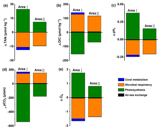 The contribution of photosynthesis, microbial respiration, coral metabolism and air–sea exchange to inorganic carbon dynamics (a–e) of the reef area of Yangmeikeng Sea Area (Area I) and Dalu Bay (Area Ⅱ) in the in November.