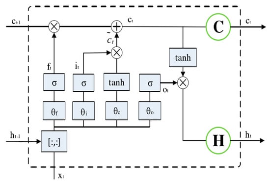 The internal specific structure of the LSTM neuron was shown in the figure below. In Figure 2, σ and tanh represent the sigmoid and tanh activation functions, respectively. The output range of the sigmoid between zero and one was used to simulate the opening of the gate. The output range of tanh between −1 and 1 was used for the normalization of the output. The input information flow enters between and , and—through the control of the input, output, and forget gates—the memory unit, , was updated to , and the neuron output, , was also obtained.