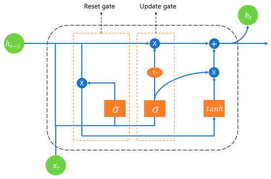 The Gated Recurrent Unit (GRU) network [20] was an optimized and simplified version of the long short-term memory (LSTM) network. The GRU network incorporated improvements to the forget and input gates, which were present in the LSTM network, by combining them into a single update gate. In this study, this update gate was used to determine the retention degree of the previous state information. The larger the update gate value, the higher the retention degree. The GRU network has several advantages over the LSTM network, including reduced training parameters, faster learning times, and, in many cases, improved forecasting performance. The structural unit of the GRU network was depicted in Figure 3, and its calculation formula could be represented as follows: