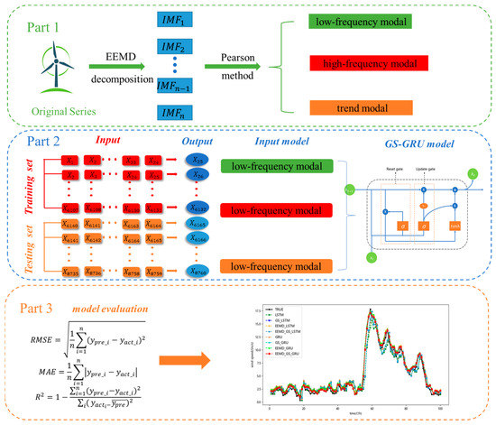 Based on the above literature review, the following gaps still exist in time series forecasting. Firstly, optimization algorithms were not commonly used in neural networks; some studies directly input wind speed time series into the neural network for forecasting. These methods could obtain great prediction results, but there is still scope to improve the prediction accuracy. Secondly, a part of studies used the same forecasting method for all subsequences after decomposition of wind speed time series, without considering the unique nature of each subsequence having different frequencies. Finally, existing artificial intelligence methods for wind speed forecasting always selected parameters through manual experience, which took a lot of time and not easy to match the optimal combination of parameters; it would affect the accuracy of wind speed forecasting. Therefore, the paper proposed a wind speed forecasting algorithm based on gated recurrent units and grid optimization search in an attempt to enhance existing forecasting models. Firstly, EEMD decomposed the original wind speed time series in the model preprocessing process, and several IMFs were obtained. Secondly, all components were separated into high-frequency, low-frequency, and trend modals based on the Pearson correlation coefficient method. Thirdly, the GRU model was established to predict the low, high, and trend subsequences, respectively. The Grid Search Cross Validation algorithm enhanced was used to optimize the GRU model. Finally, the forecasting for these components were summed to give the ultimate wind speed value. Experimental results have demonstrated that this model outperforms contrast models in this paper in terms of its forecasting accuracy.