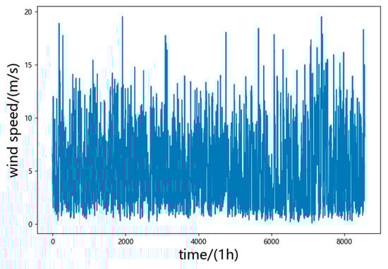 In this calculation example, we used the measured wind speed data from a wind farm in northwest China, from 1 March 2020 to 28 February 2021, as the example analysis. The data interval was 1 h, with a total of 8760 pieces of data. In total, 0.2% of the data were missing, so the data were completed using the linear interpolation method. The wind speed time series was shown in the Figure 5.