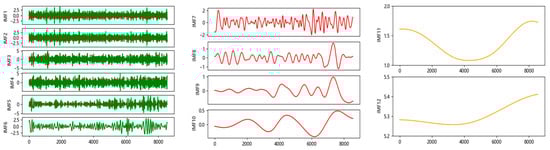 - EMD decomposition was performed on the obtained noise-containing signal, , and the form of the respective IMF’s sum was obtained, as follows:where was the -th IMF decomposed after adding white noise for the i-th time; was the residual function, which represents the average trend of the signal; and J was the IMF’s quantity.