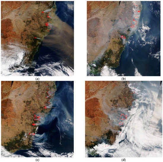 The time series of BC concentration at various sites reflects the progress of the Black Summer 2019–2020 wildfires in southeast Australia during this period. Fires started in early November 2019 in northern NSW and the Gospers Mountain in the Blue Mountains, northwest of Sydney, which then spread to most of the Blue Mountains, west of Sydney, and lasted for most of December 2019. Then, fires occurred in the Southern Highland, the South Coast, south of Sydney, to the border region of Victoria in late November 2019 until 7 January 2020 when fires subsided. From 8 January 2020, no more wildfires occurred in NSW but still occurred in northeast Victoria until the middle of January. Remote sensing data of hot spots from MODIS Terra/Aqua satellites as shown in Figure 4 show the progress and extent of the wildfires. Wildfires began in northern NSW and the Blue Mountains in early November 2019 (Figure 4a). BCwb concentrations were high in November at Armidale in northern NSW, Richmond and Liverpool in the northwest and west of Sydney, especially on 21 November 2019, when smoke covered most of northern NSW and smoke from fires in the Gospers Mountain of the Blue Mountains drifted to the west of Sydney (Figure 4b). By early December 2019, wildfires started occurring at the NWS and Victoria border near the coast (Figure 4c). High concentrations of BCwb were detected on 11 December 2019 at Newcastle, Liverpool and Wollongong when fires in the Blue Mountains, Southern Highlands were intense. On this day, fires in the South Coast also affected Canberra (Australian Capital Territory), as shown in Figure 4d. High concentrations of BCwb also occurred in Wollongong, Wagga Wagga and Richmond, Liverpool in Sydney on 21 and 30 December 2019 when fires in the Blue Mountains, Southern Highland and South Coast covered most of NSW with smoke (Figure 4e,f).