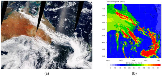 In addition to aerosols, clouds and water vapour have an important role in the reflection and absorption of incoming solar radiation. Their effect is determined in the study of aerosol effect by using clear sky simulation to exclude their effects, then comparing the results with those when full clouds and water vapor are included. An example of cloud reflection and hence reducing net radiation from the results of simulation of the December 2019–2020 wildfires study is shown in Figure 10 for the simulated day of 1 December 2019 with MODIS observed and hot spots from fires. This day was cloudy with a cumulus cloud band from northern Australia and northern NSW to New Zealand. The simulation of shortwave (SW) downward and upwelling radiation at the TOA essentially captured the cloud reflection.